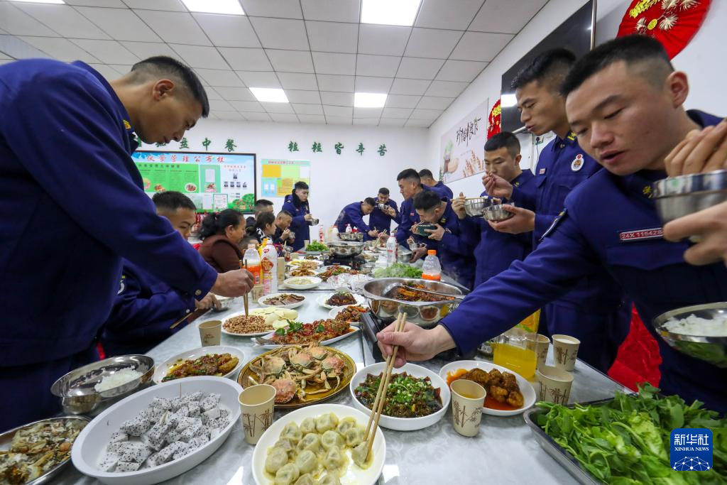 2月9日,消防员们在贵州贵阳市云岩区消防救援大队食堂吃年夜饭。