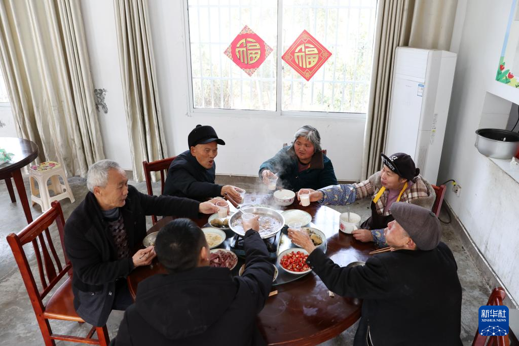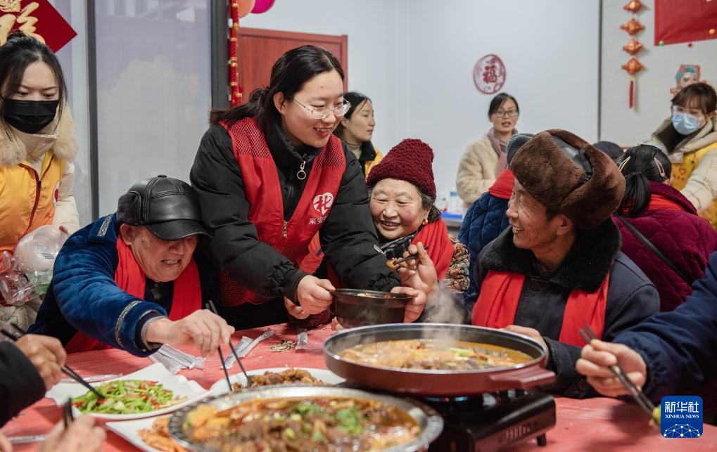 2月9日,安徽省滁州市来安县新安镇社工组织空巢老人一起吃爱心年夜饭。
