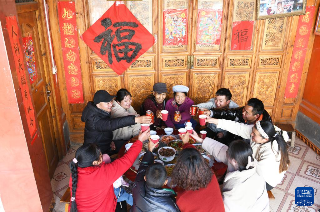 2月9日,在云南省大理白族自治州剑川县马登镇文屏村,白族村民一家人在吃年夜饭。