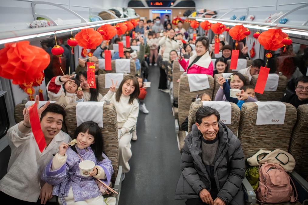 2月9日,在D38次列车上,武汉客运段汉口城际动车组车间“凤舞楚天”乘务组为乘客发放饺子,大家一起吃饺子过除夕。