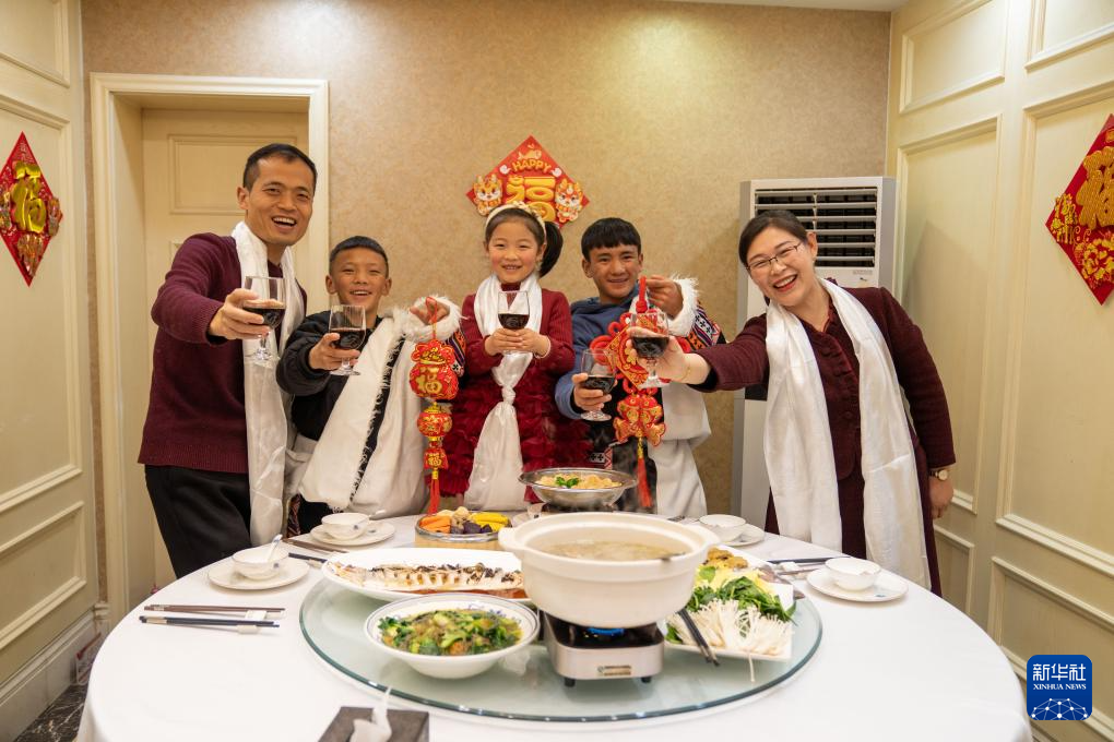 2月9日,合肥理工学校西藏班的学生桑杰顿珠(左二)、次巴扎西(右二)和包保老师万霞(右一)一家贺新春、吃年夜饭。