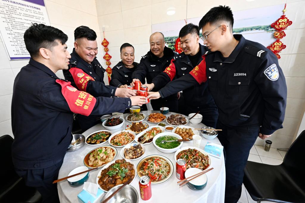 2月9日,银川铁路公安处石嘴山车站派出所值班民警一起吃“年夜饭”。