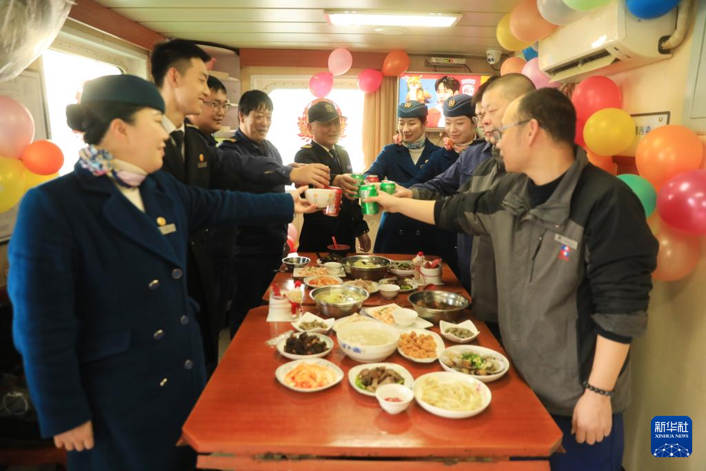2月9日,在位于浙江省舟山市朱家尖蜈蚣峙客运码头的“新海华69”船舱内,船员利用休息时间一起吃团圆饭。