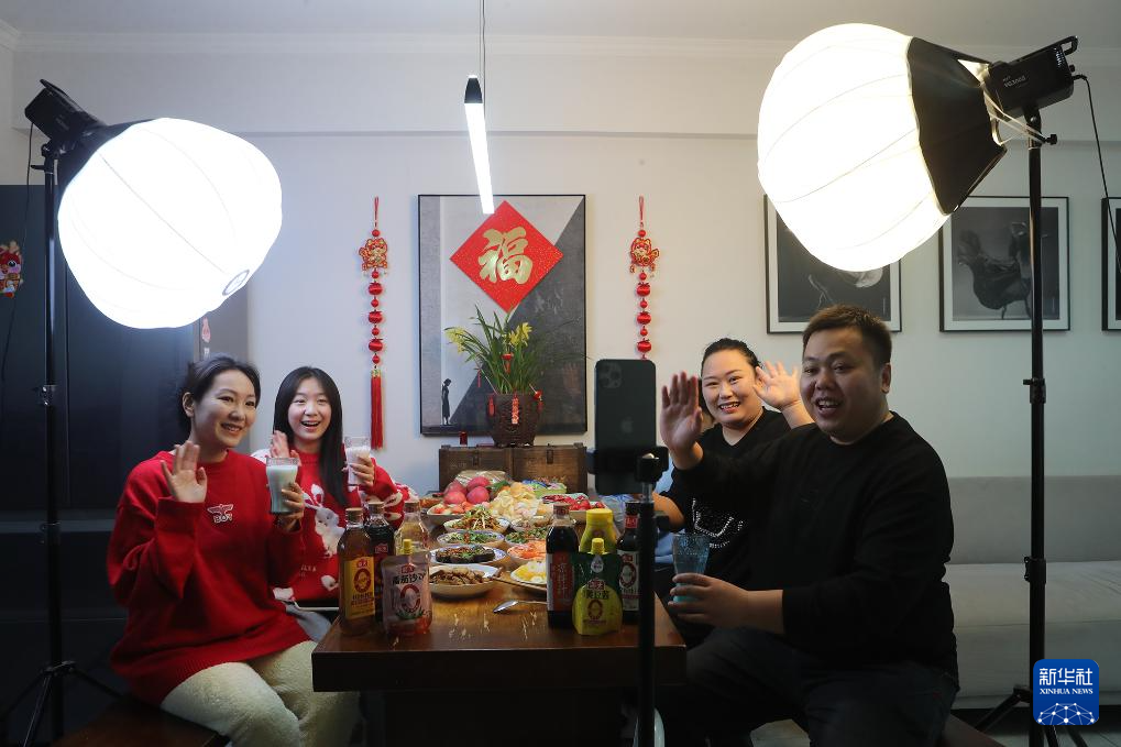 2月9日,河南省商丘市一名网络主播(左一)在家中直播吃团圆饭。