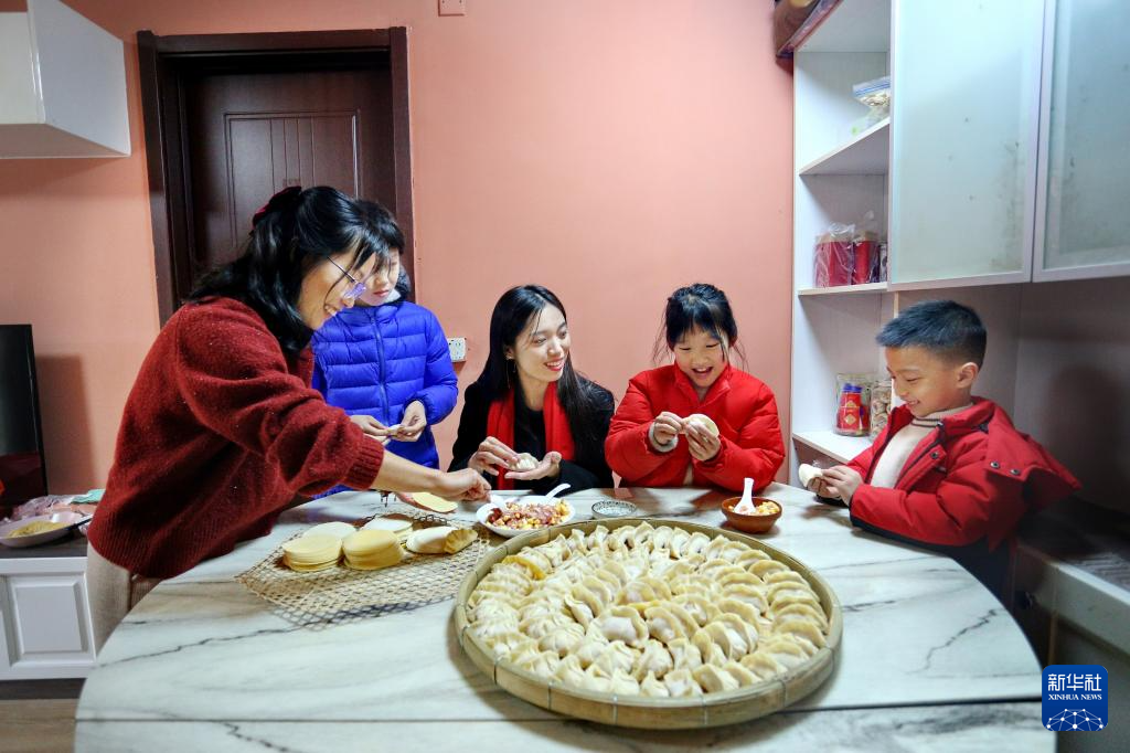 2月9日,在广东省鹤山市沙坪街道一家人在包饺子,享受团圆之乐。