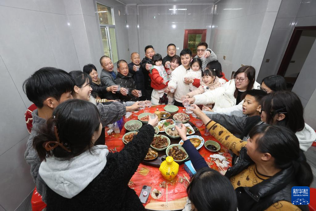2月9日,消防员们在贵州贵阳市云岩区消防救援大队食堂举杯庆祝。