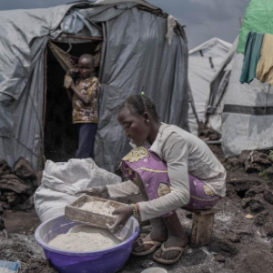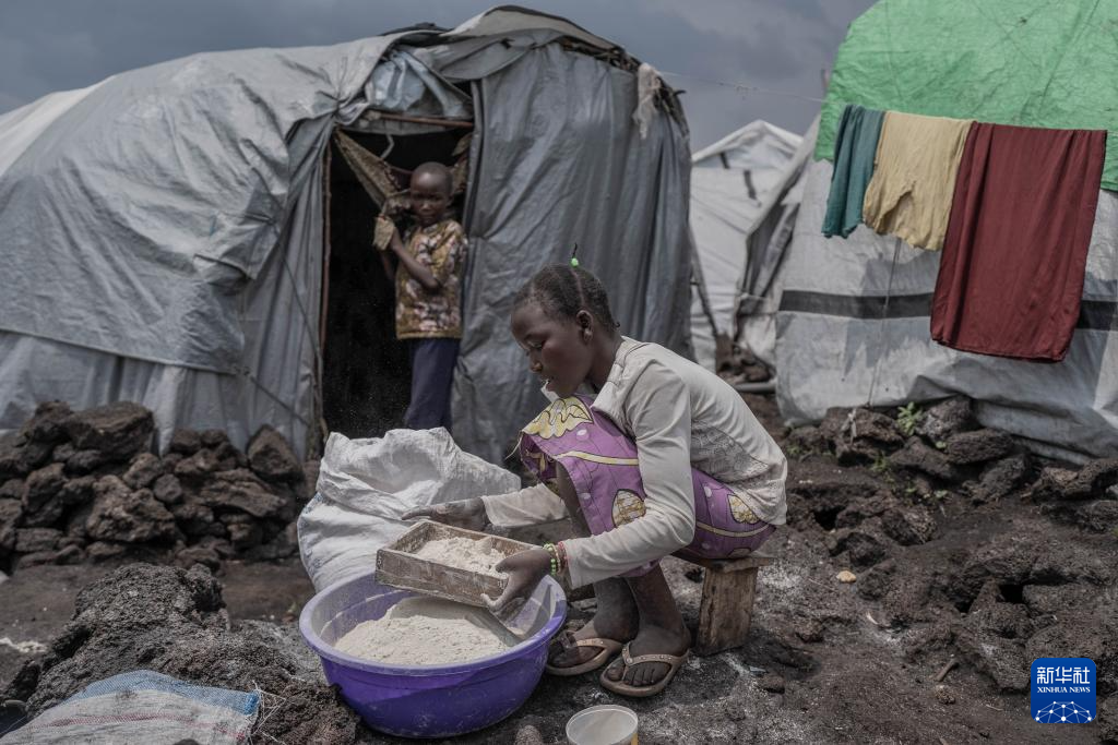2月8日,在刚果(金)北基伍省首府戈马市郊的一座难民营内,居民在简易搭建的帐篷外准备食物。