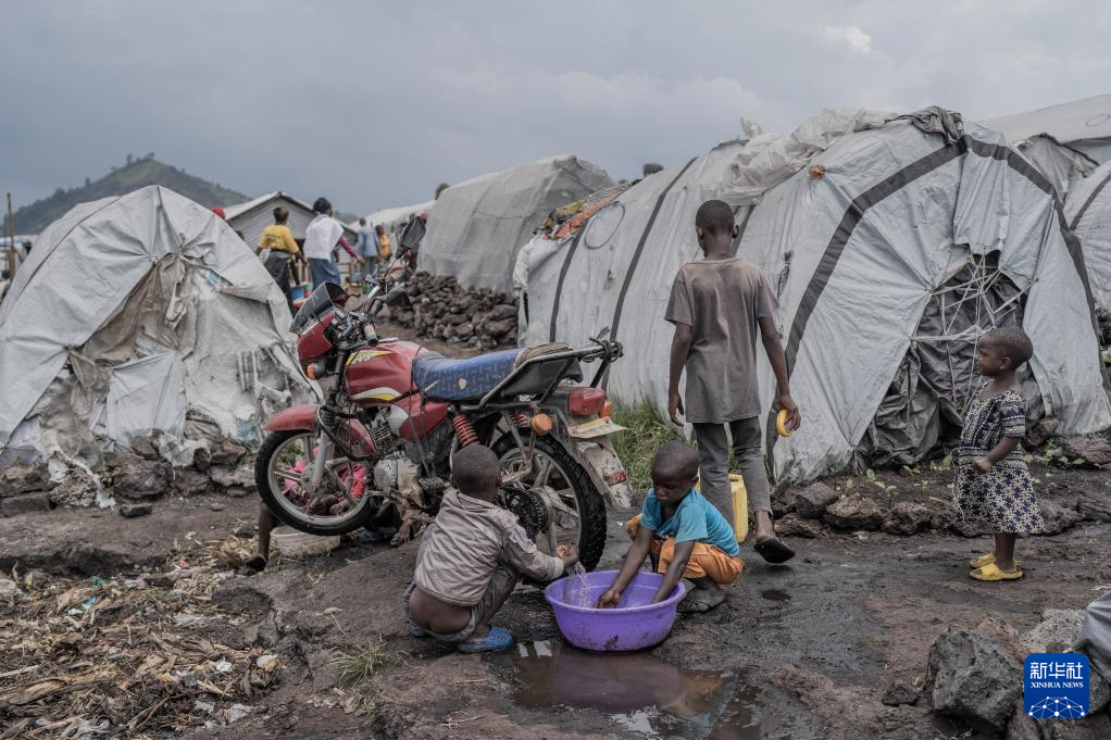 2月8日,在刚果(金)北基伍省首府戈马市郊的一座难民营内,几名儿童在擦洗摩托车。