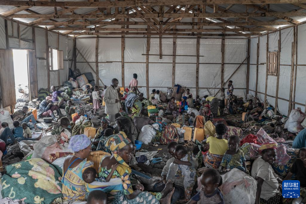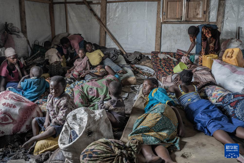 2月8日,在刚果(金)北基伍省首府戈马市郊的一座难民营,人们在拥挤的棚屋内栖身。
