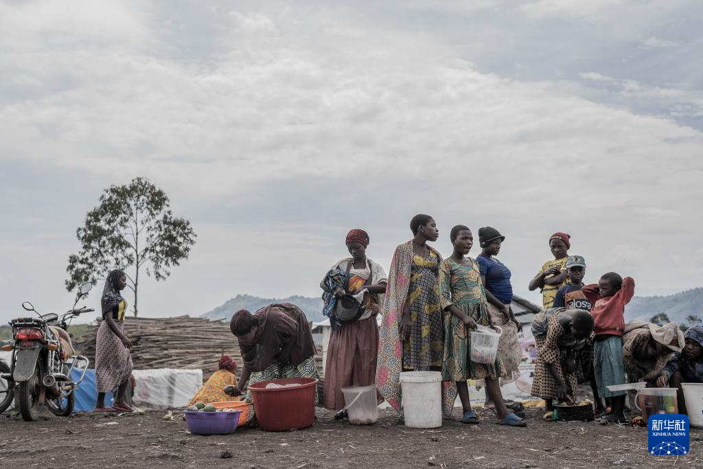 2月8日,在刚果(金)北基伍省首府戈马市郊的一座难民营内,人们排队等待打水。