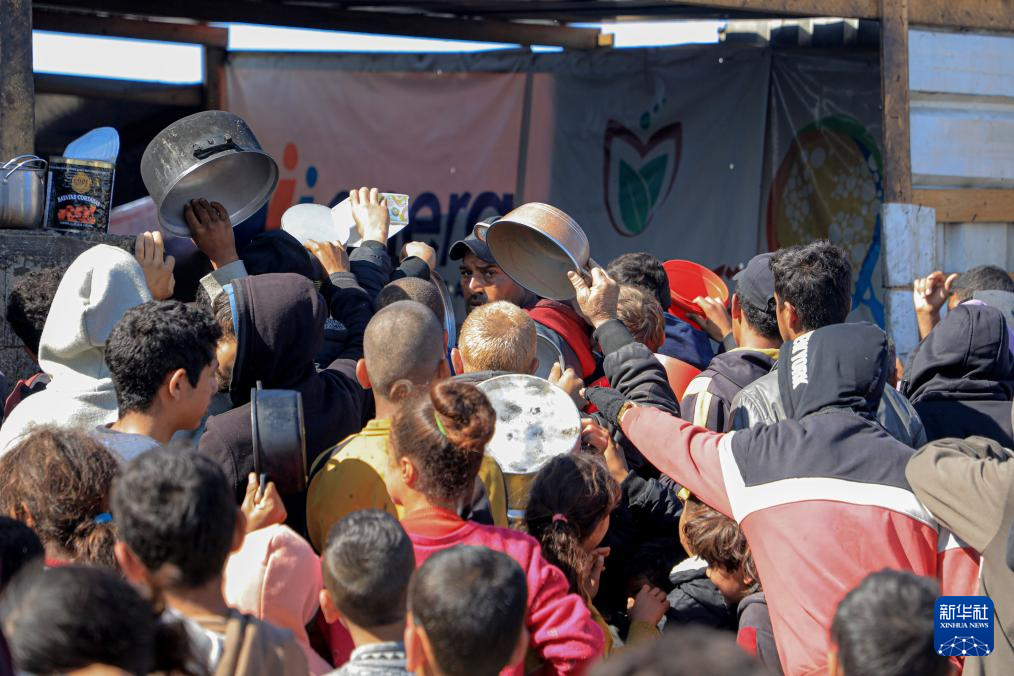 2月9日,在加沙地带南部城市拉法,巴勒斯坦人排队领取救济食物。