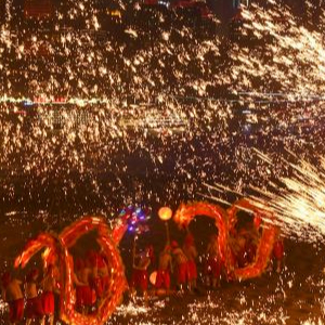 这是2月9日晚在重庆南滨路拍摄的火龙表演场面。