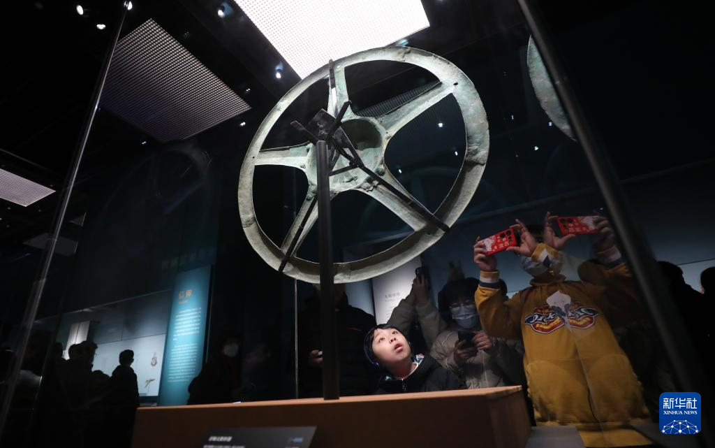 2月10日,在上海博物馆东馆举办的“星耀中国 三星堆·金沙古蜀文明展”上,参观者在商代青铜太阳形器展品前驻足观看。