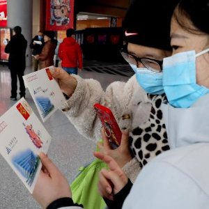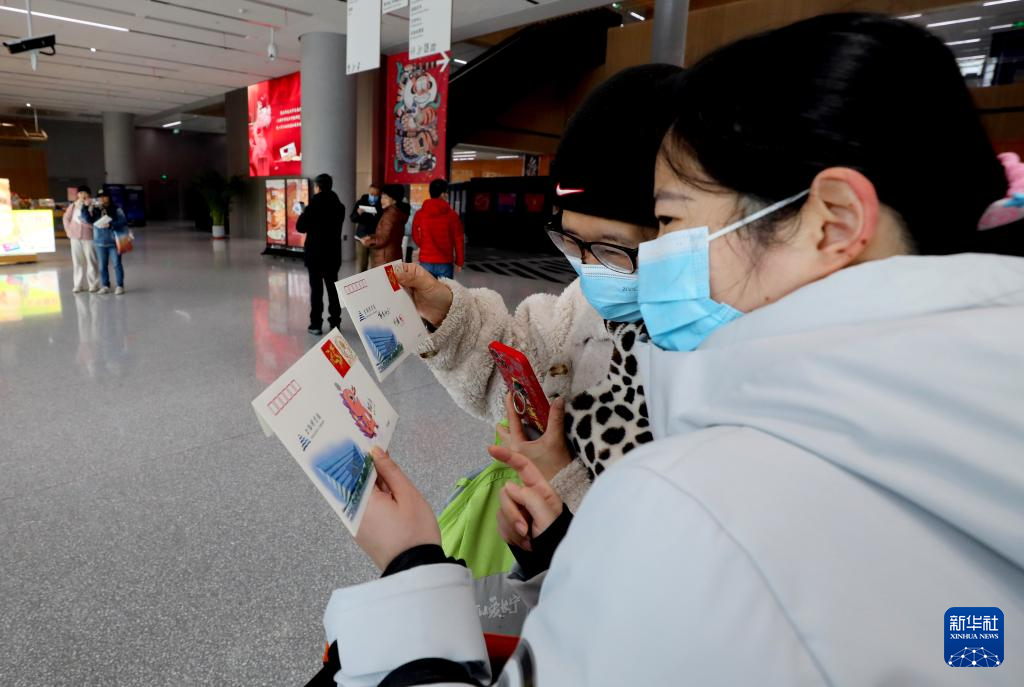 2月10日,市民在上海图书馆东馆入口处查看馆方赠送的春节纪念品。
