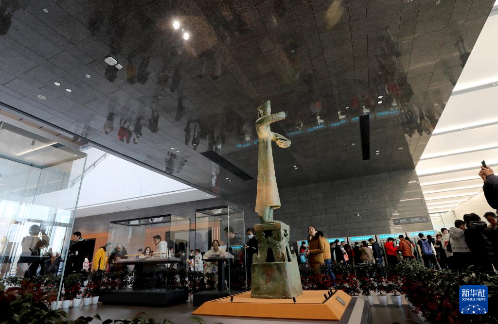 2月10日,参观者从上海博物馆东馆入口处展出的兽面冠青铜人像(复制品)旁走过。