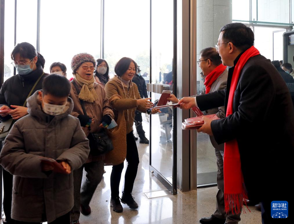 2月10日,上海博物馆东馆工作人员在入口处向进馆市民赠送春节纪念品。