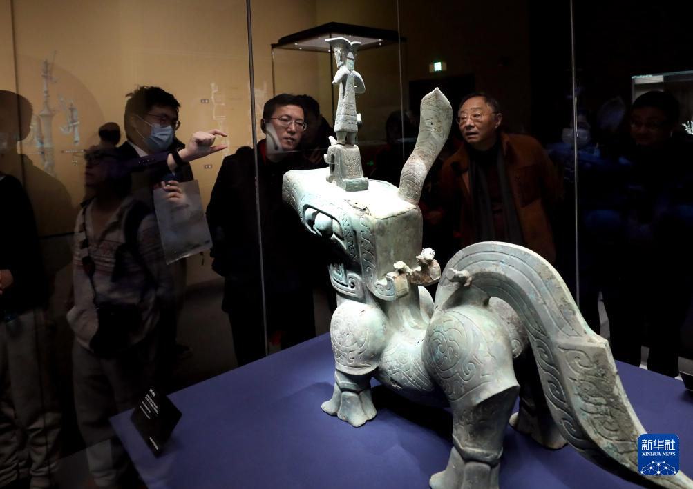 2月10日,在上海博物馆东馆举办的“星耀中国 三星堆·金沙古蜀文明展”上,参观者在商代青铜大神兽展品前驻足观看。