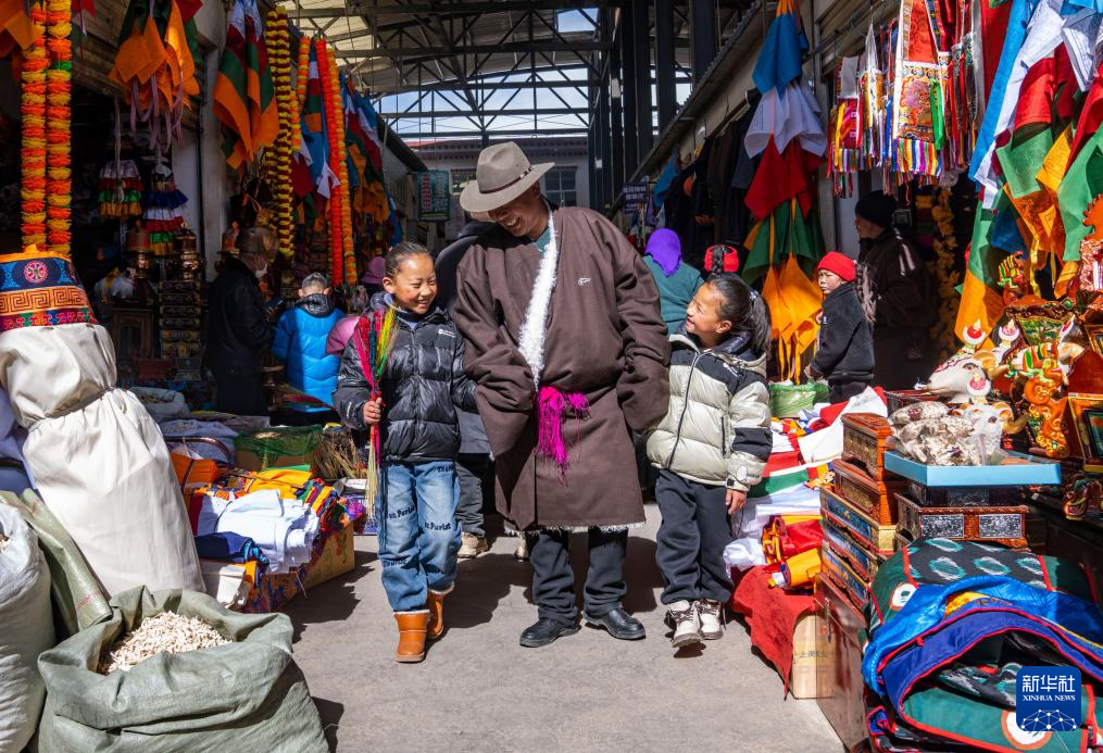 索朗罗达和孙女们在当雄县的年货市场买年货(2月3日摄)。