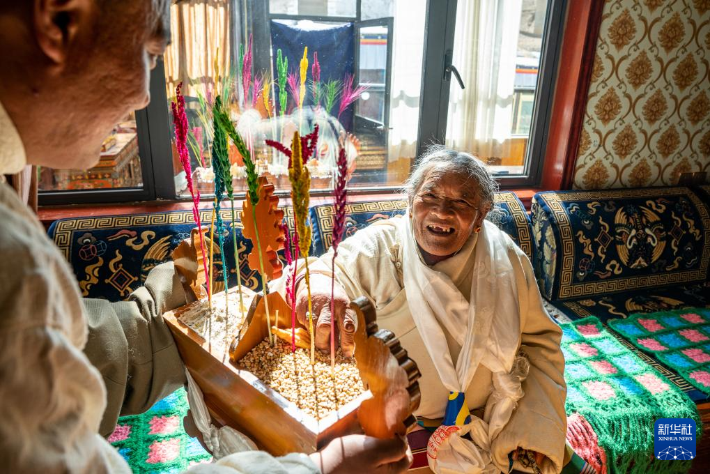 2月10日,斯曲旺姆的儿子索朗罗达(右)为母亲敬上青稞酒。
