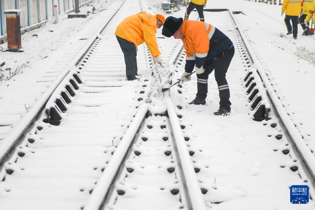 近日,湖北多地遭遇低温雨雪冰冻天气,中国铁路武汉局集团有限公司组织工人加紧对铁路设备进行道岔积雪清扫、接触网除冰作业,同时做好旅客疏导、应急值守工作,加大线路设备巡检范围,以应对雨雪天气对铁路带来的不利影响。
