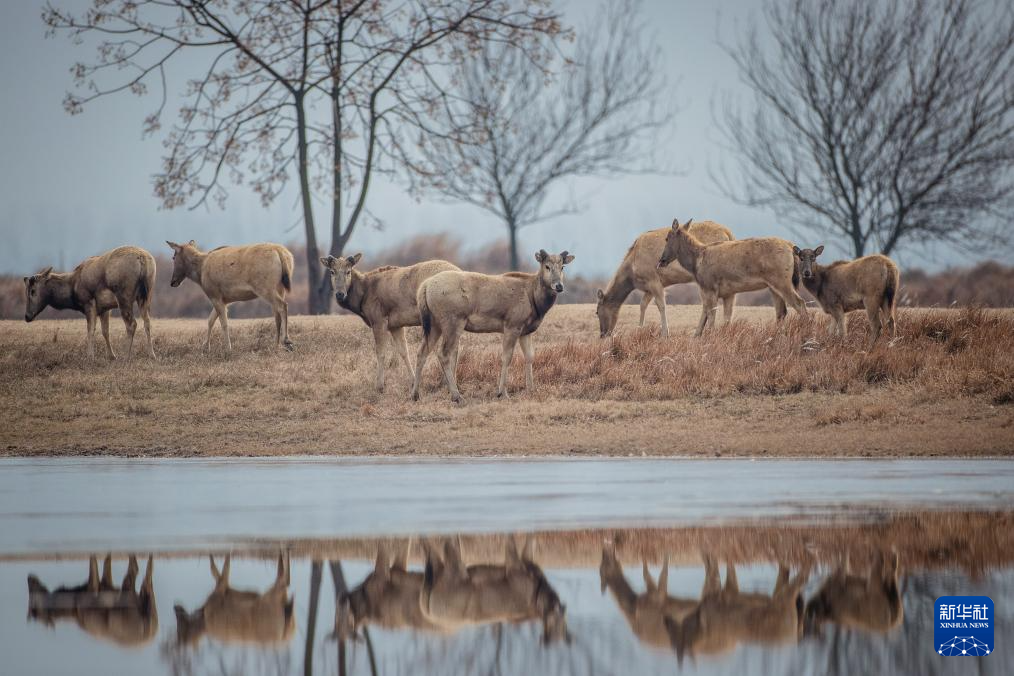 麋鹿擅长游泳,喜好沼泽湿地生境,多在河滩浅水周围活动,即使是冬天也不例外。为了应对严寒,每年10月左右,麋鹿便会换下赤锈色的夏季体毛,换上又长又厚的保暖灰色冬毛。