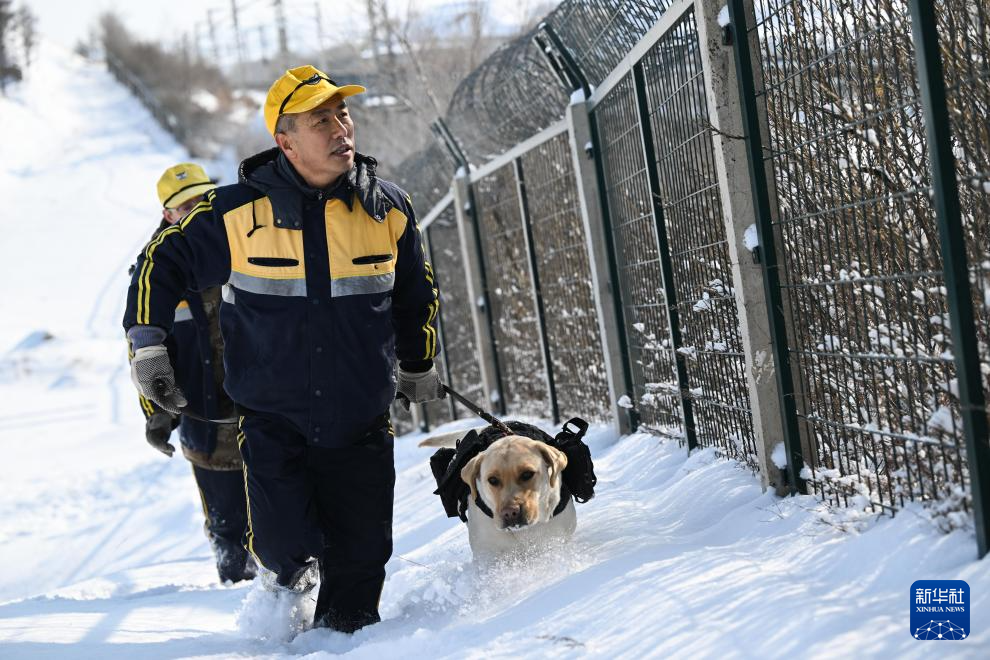 2月7日,刘贵兵(前)牵着“大黄”巡护检查。