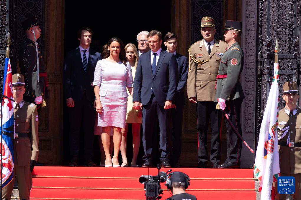 这是2022年5月14日诺瓦克·卡塔琳(中左)在匈牙利首都布达佩斯的国会大厦前参加总统就职典礼时的资料照片。