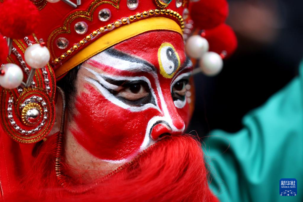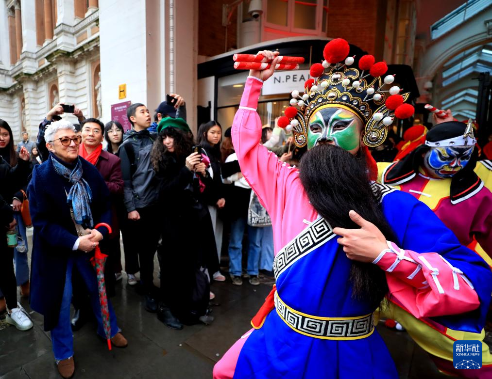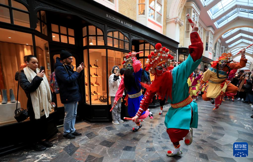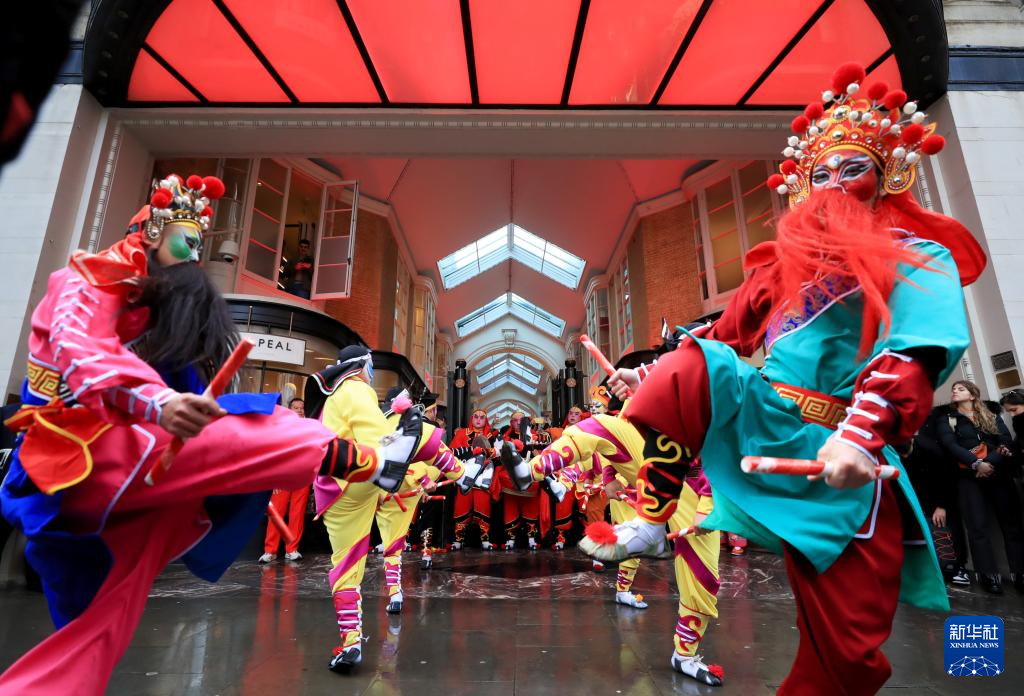 2月10日,演员在英国伦敦伯灵顿拱廊街表演英歌舞。