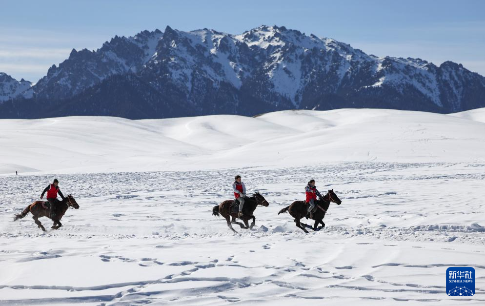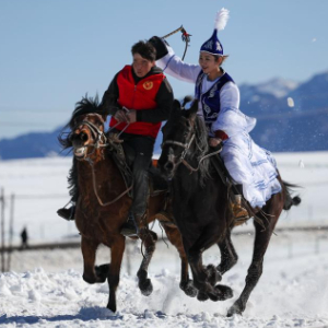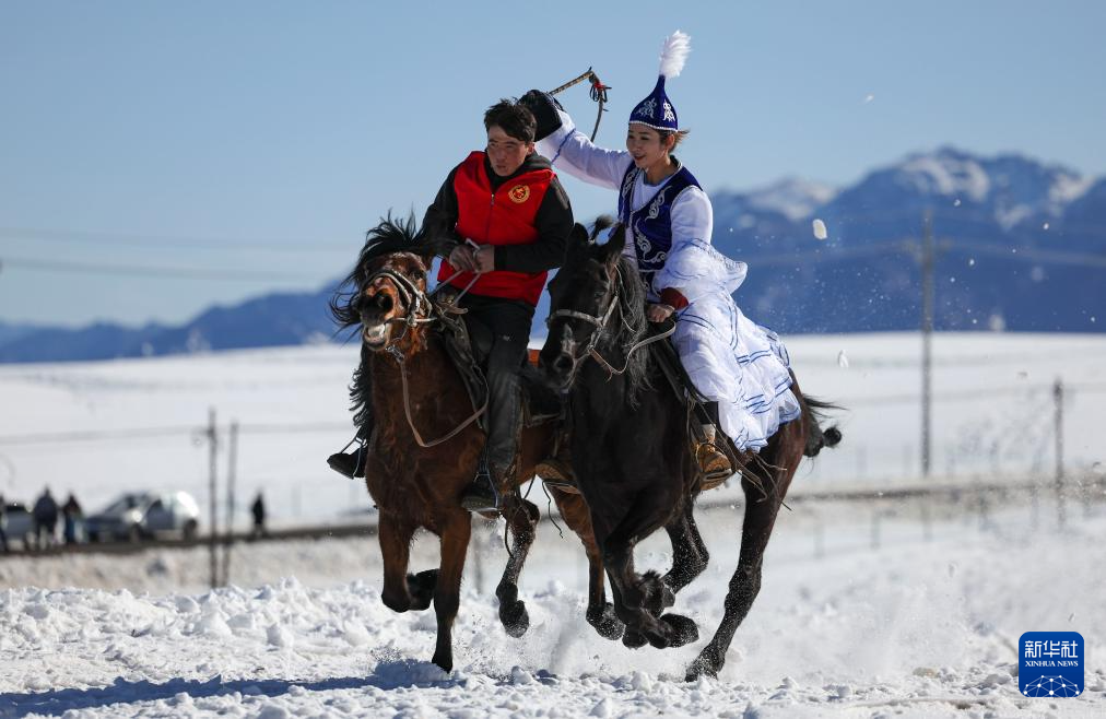 农历大年初二,新疆乌鲁木齐县“春节八天乐”系列活动——传统体育民俗闹新春在甘沟乡进行。村民们在冰雪覆盖的乌拉斯台草原上进行雪地赛马、“姑娘追”、马上拾银、叼羊等比赛,欢度新春。
