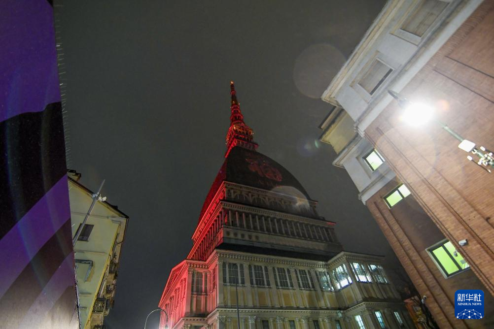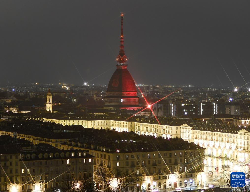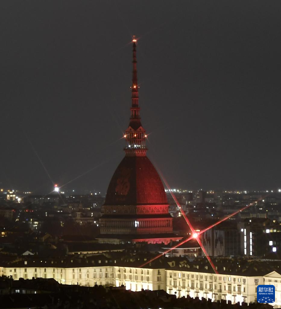2月10日晚,意大利都灵的地标性建筑安托内利尖塔点亮“中国红”和“福” 字,庆祝中国春节。