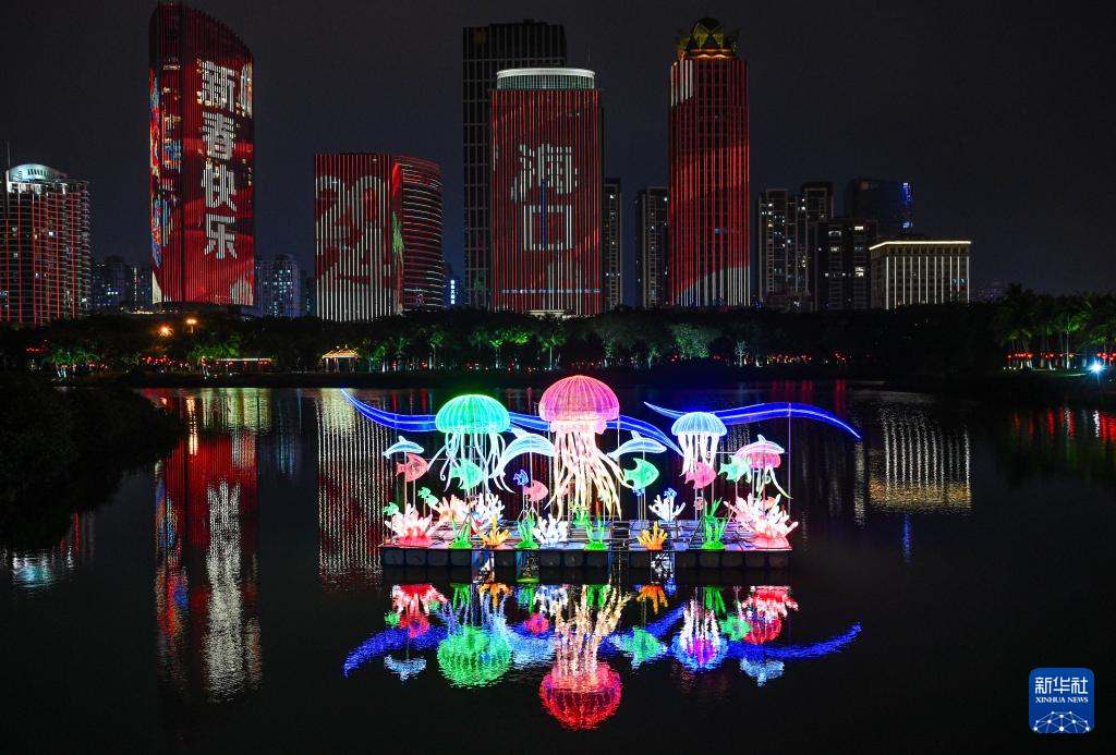 2月10日在海口市万绿园拍摄的万春会花灯和滨海大道高层建筑灯光秀。