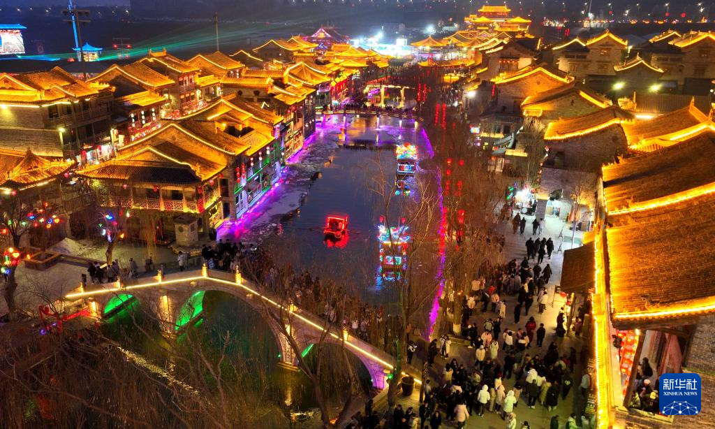 2月10日,游客在河北省唐山市丰南区河头老街观看文艺节目(无人机照片)。