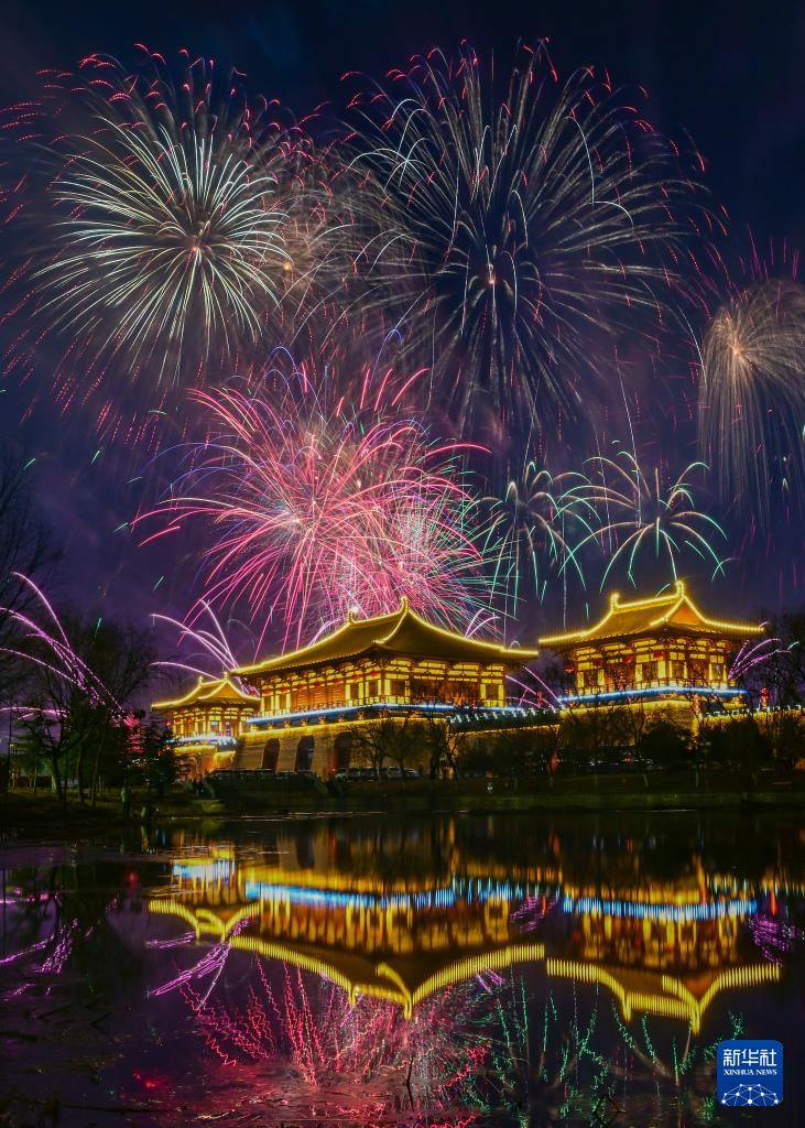2月10日,河南洛阳次第腾空的焰火五彩斑斓。