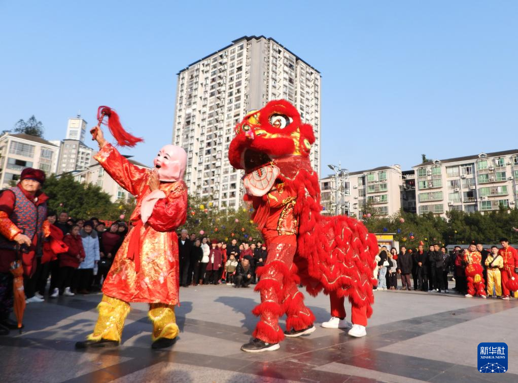 2月11日,四川省达州市渠县渠南街道万兴广场,民间艺人表演狮舞祈福。