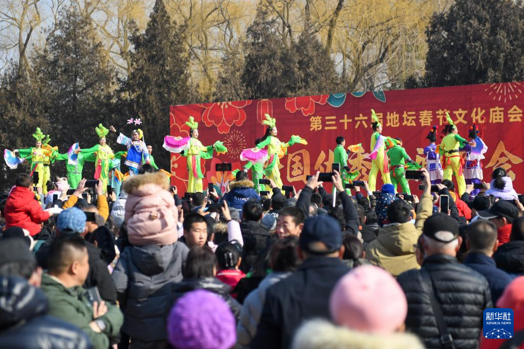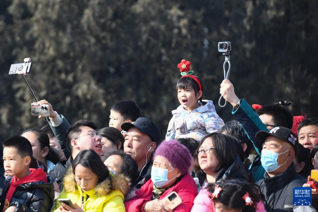 2月12日,游人在北京地坛春节文化庙会观看表演。