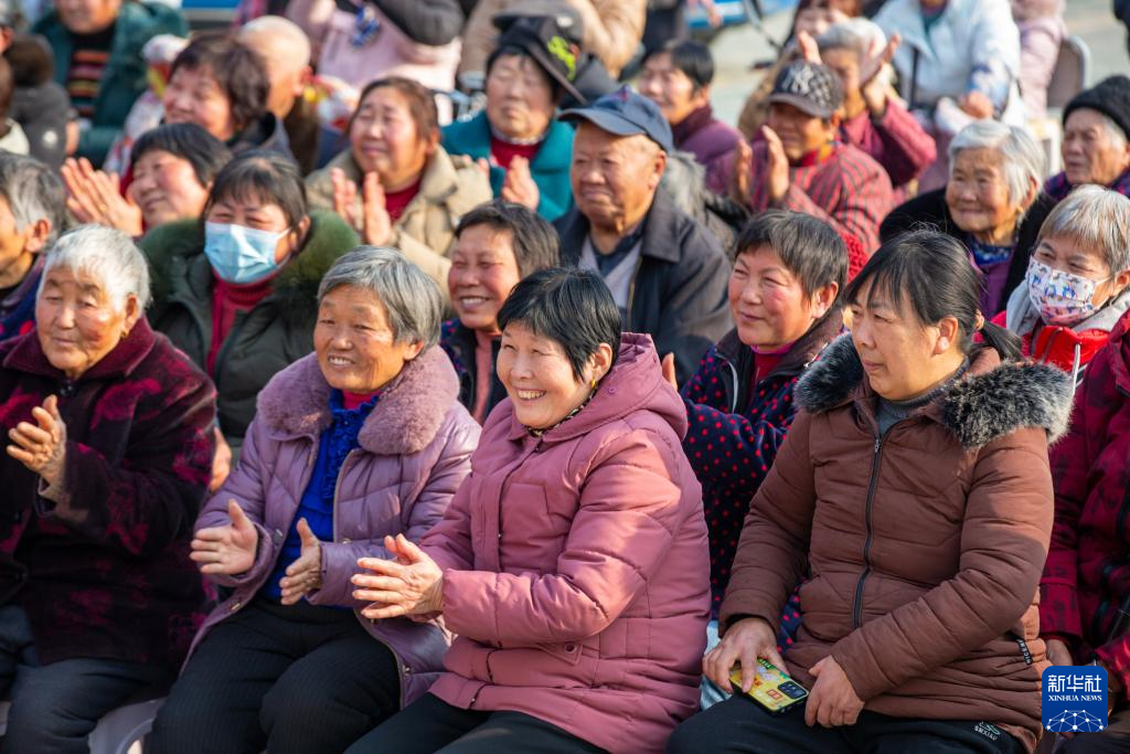 2月11日,江苏省海安市胡集街道园庄村村民在“村晚”上欣赏文艺节目。