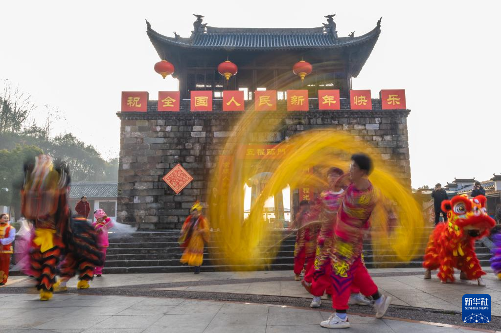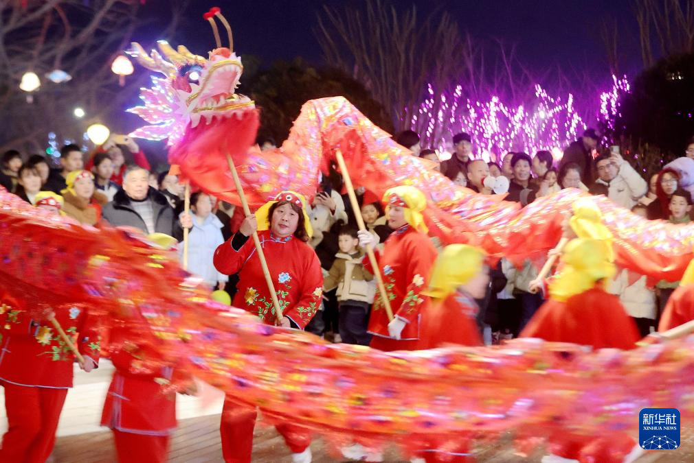 2月11日晚,浙江省湖州市德清县下渚湖街道宝塔山村女子舞龙队为游客表演舞龙。