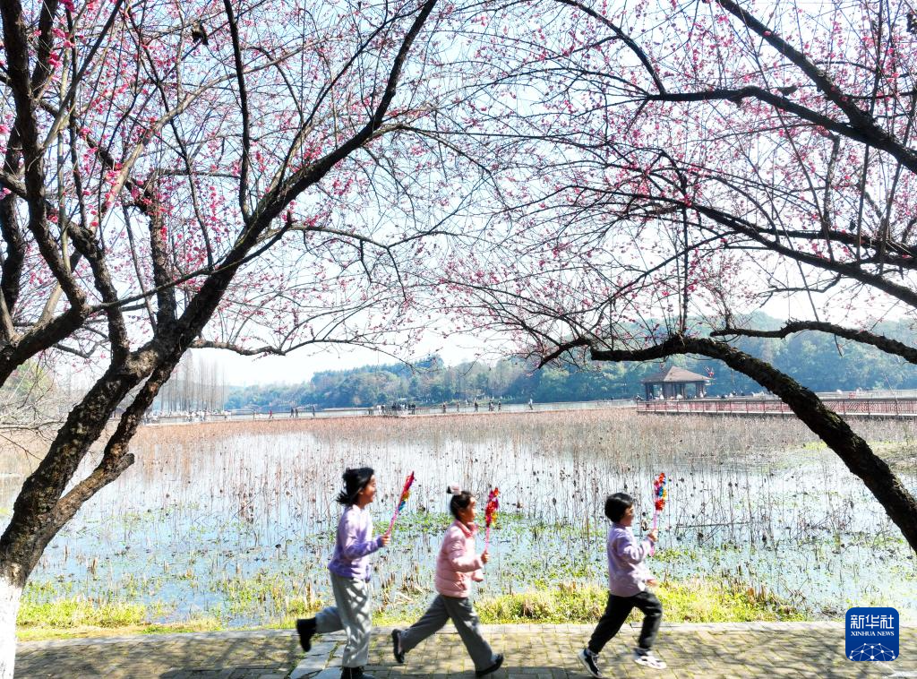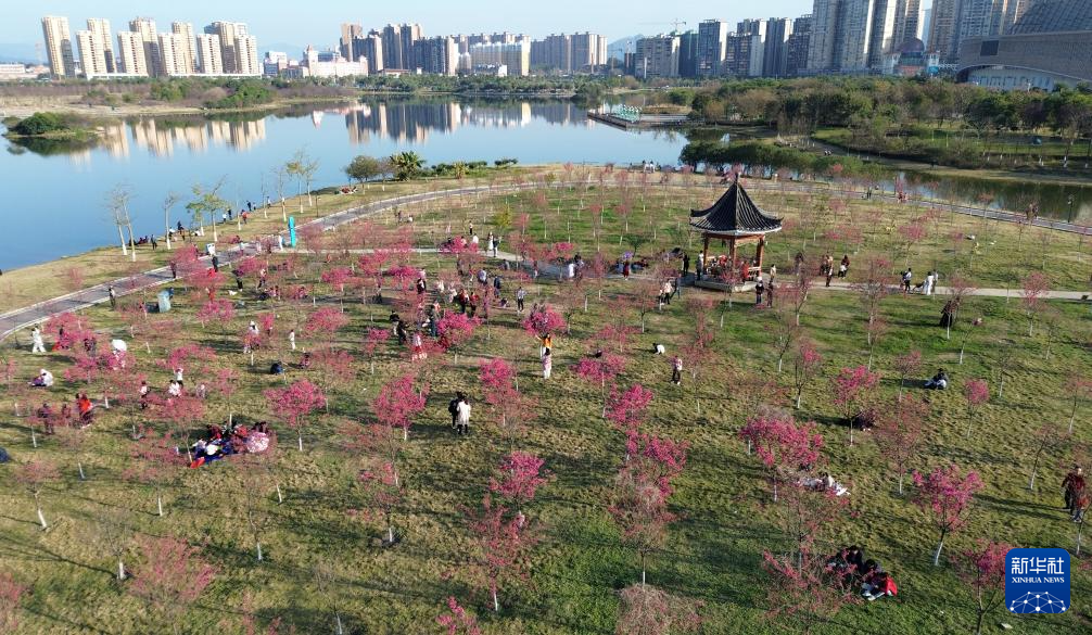2月11日,游人在广西贺州市爱莲湖公园观赏盛开的樱花(无人机照片)。