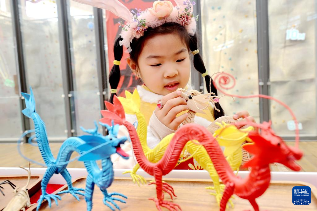 2月11月,小朋友在贵州省黔东南苗族侗族自治州丹寨县万达小镇参与新春庙会活动。