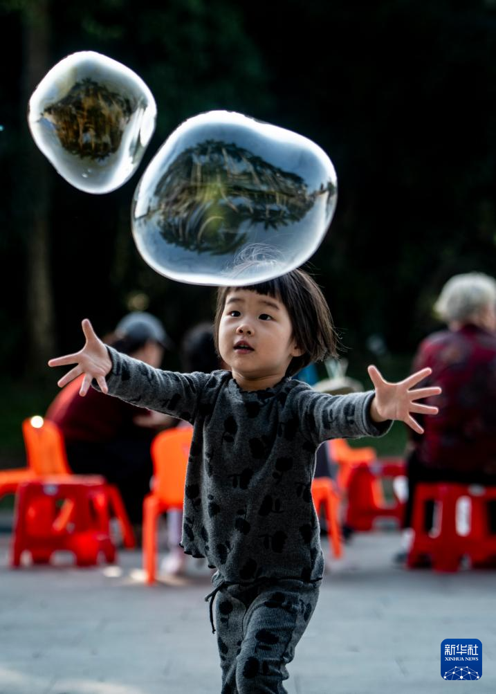 2月11日,小朋友在海南省琼海市万泉河广场追泡泡。