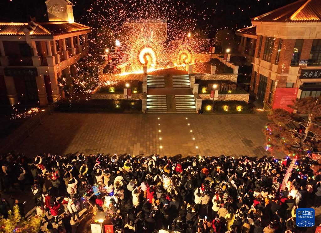 2月11日,在湖南省衡阳市南岳区祝融小镇,人们观看非遗打铁花表演(无人机照片)。
