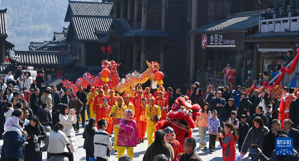 2月11日,重庆市酉阳土家族苗族自治县酉州古城,游客在观看传统龙灯表演。