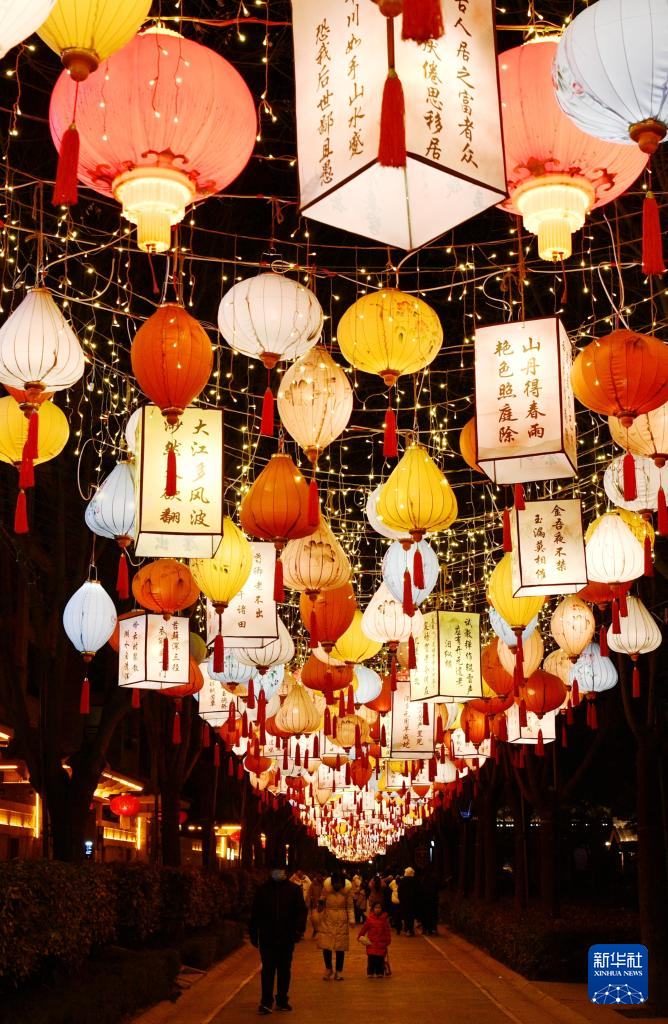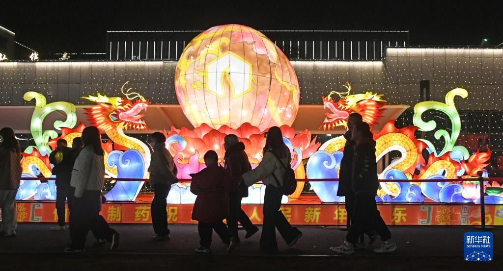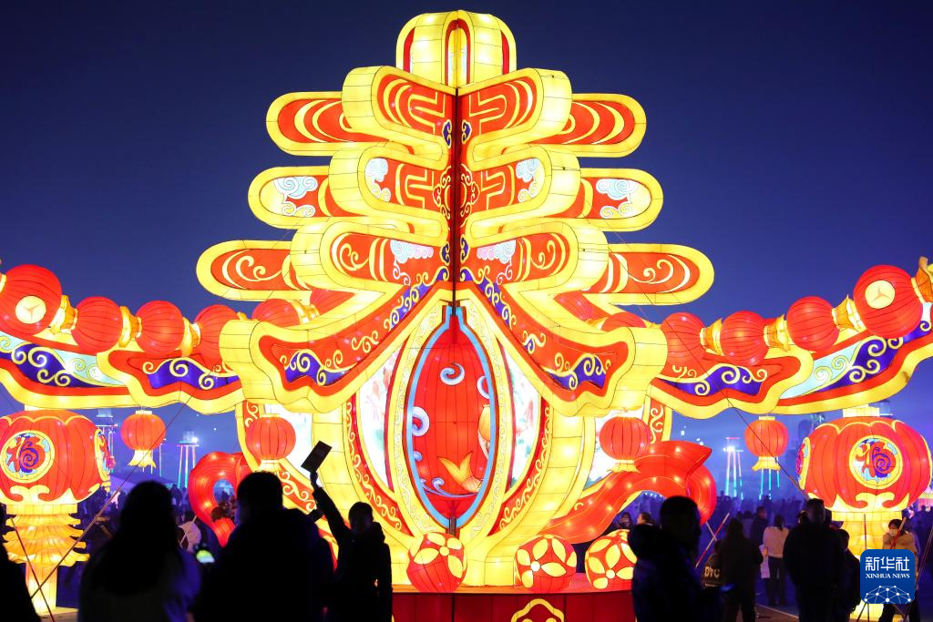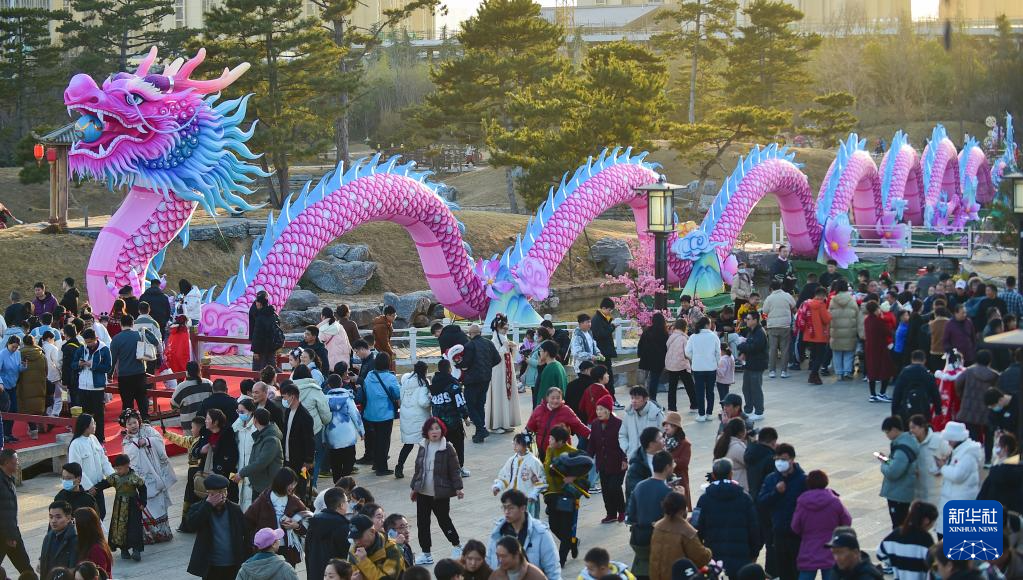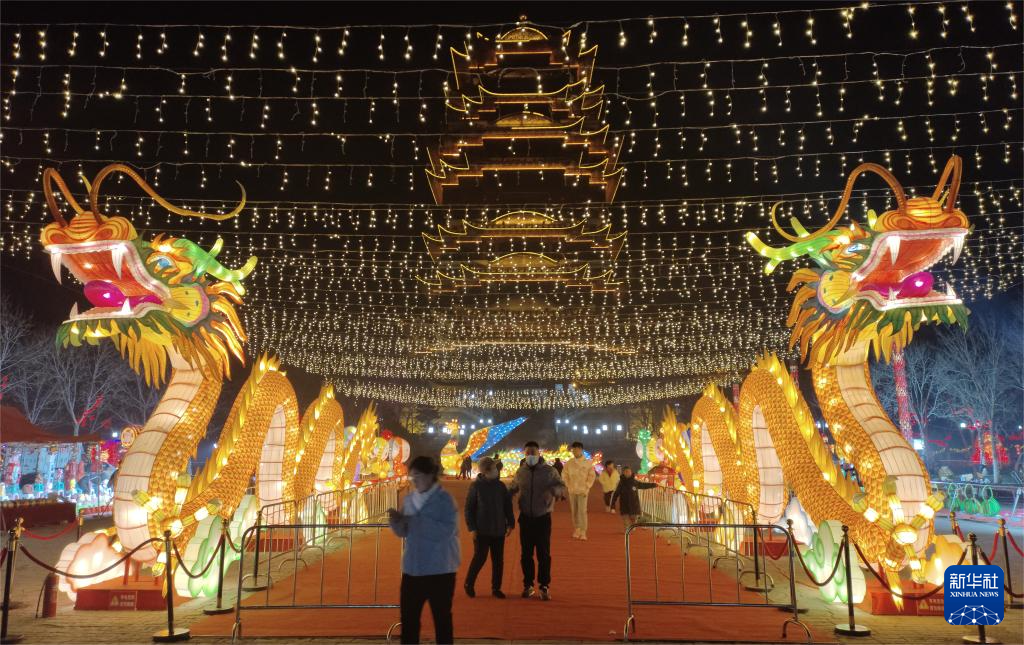 2月11日,在河南省洛阳市隋唐洛阳城国家遗址公园九洲池景区,游客观赏以龙为主题的“皇家灯会”。