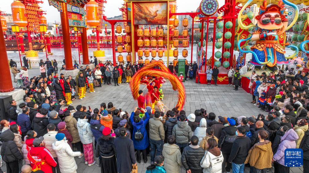 2月11日,游客在河北省唐山市丰南区河头老街观看舞龙表演(无人机照片)。