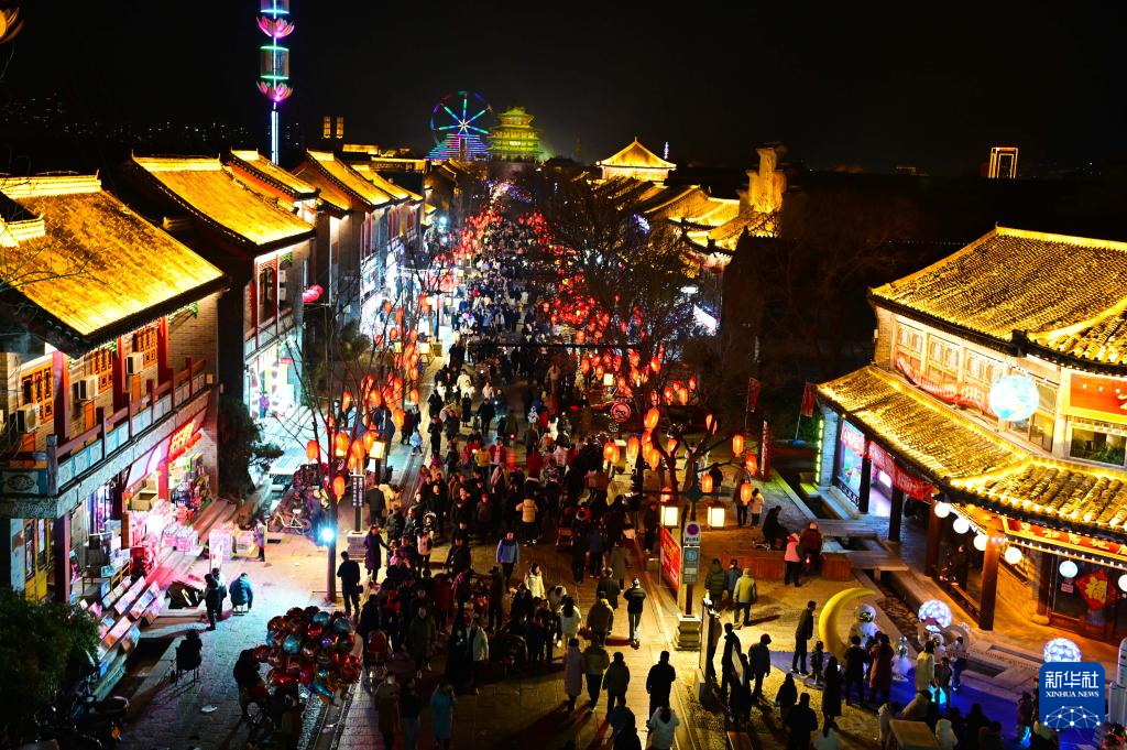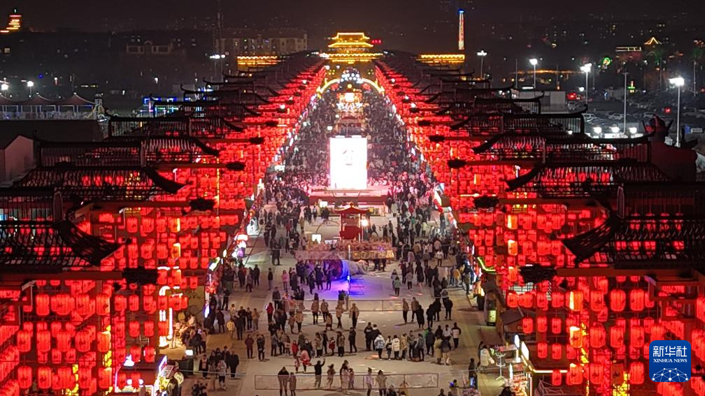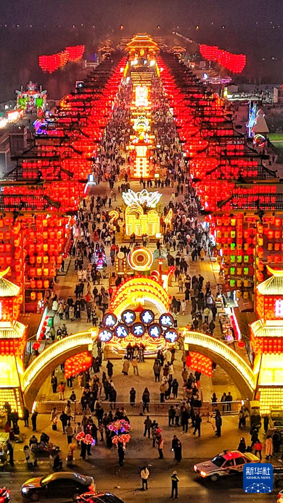 2月11日,游客在山东省滨州市惠民县孙武不夜城观赏夜景(无人机照片)。