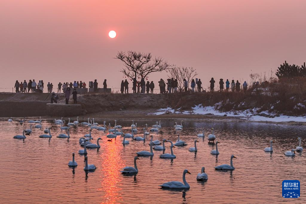 2月12日,在山东省荣成大天鹅国家级自然保护区天鹅湖湿地,游客在观日出、赏天鹅。