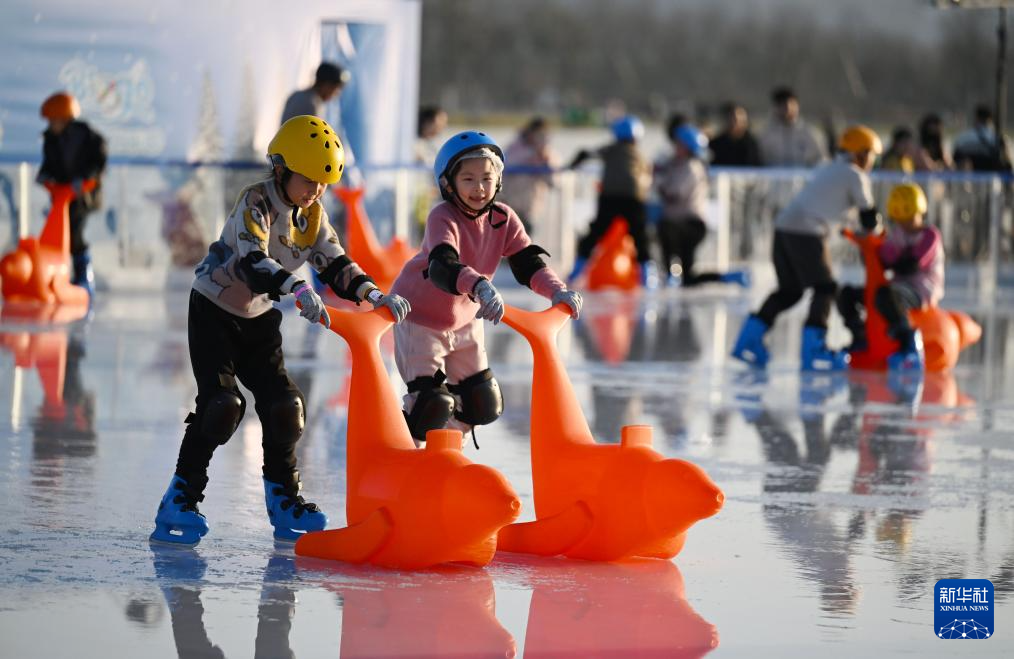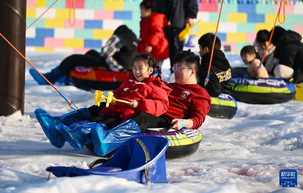 2月12日,市民带着小朋友在合肥骆岗公园体验冰雪运动。