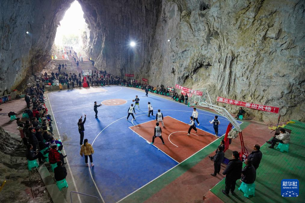 2月12日,贵州省毕节市纳雍县猪场乡新春村在溶洞篮球场举行篮球联谊赛,吸引众多村民前来观赛。