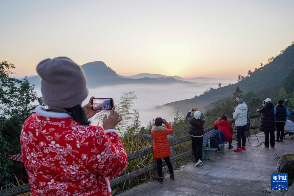2月12日,武夷山国家公园内云雾缭绕,游客在山顶观赏日出云海。