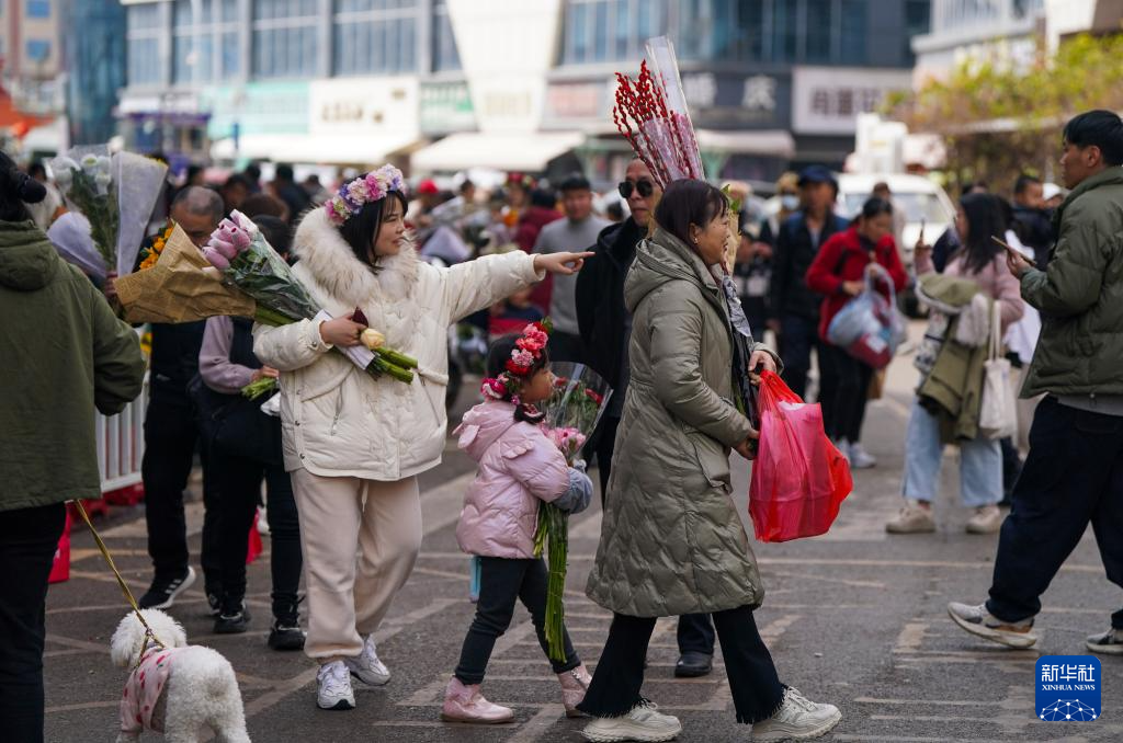 2月12日,人们在昆明斗南花卉市场游玩买花。